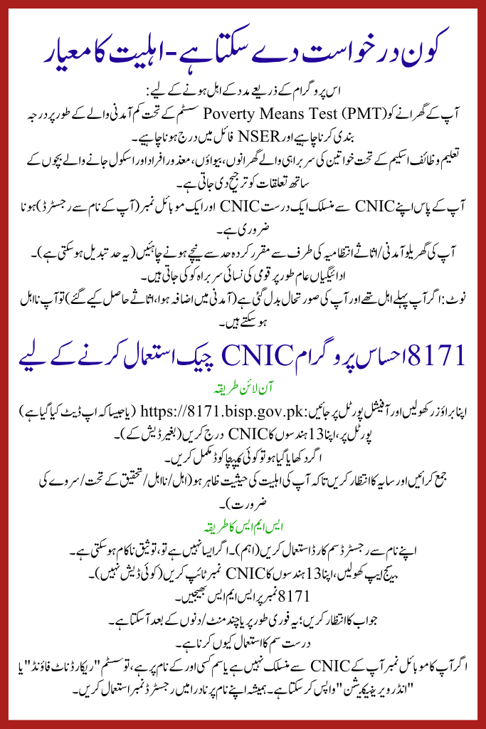 | Method of Application | Online via official portal or SMS by sending CNIC to 8171 |