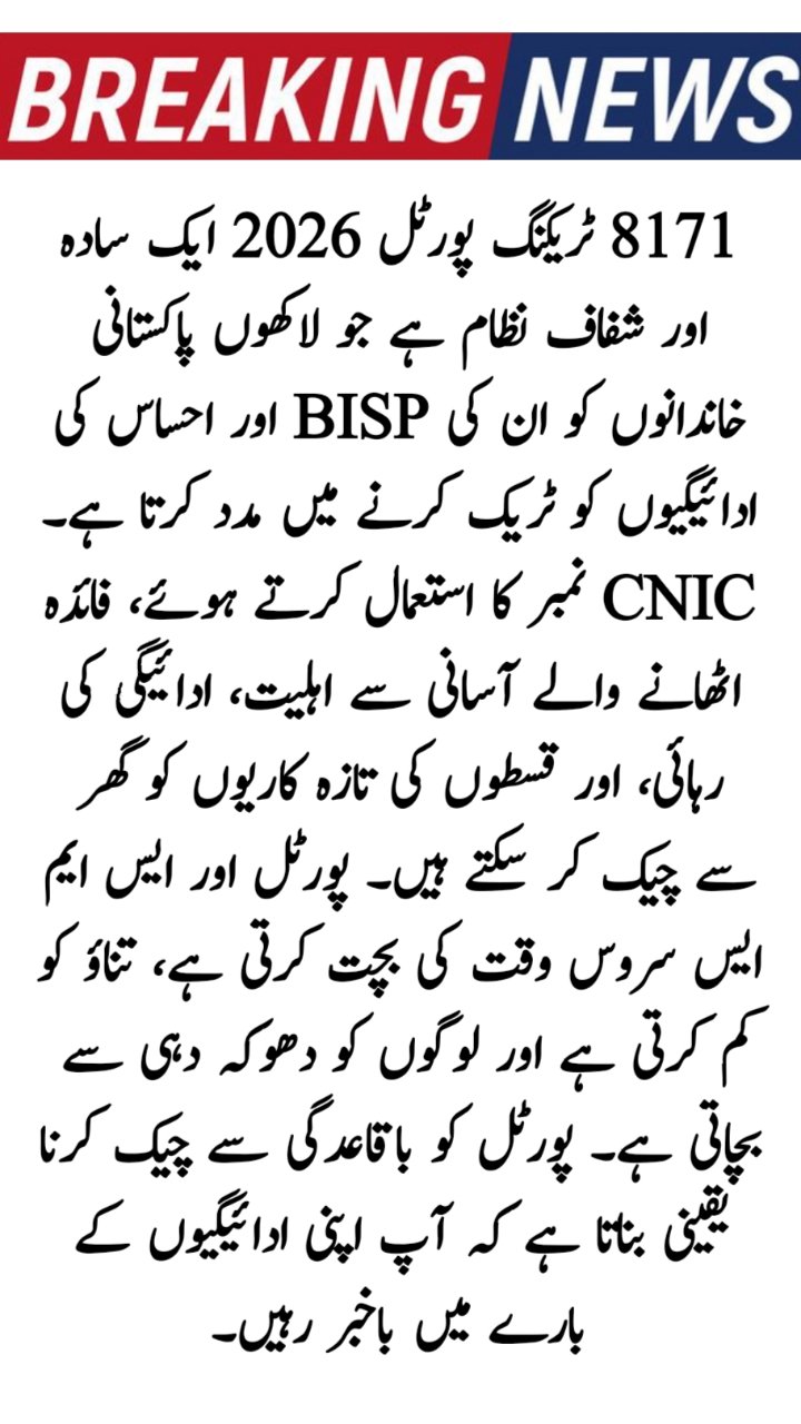The 8171 Tracking Portal 2026 is a simple and transparent system that helps millions of Pakistani families track their BISP and Ehsaas payments. By using a CNIC number, beneficiaries can easily check eligibility, payment release, and installment updates from home. The portal and SMS service save time, reduce stress, and protect people from fraud. Regularly checking the portal ensures you stay informed about your payments.