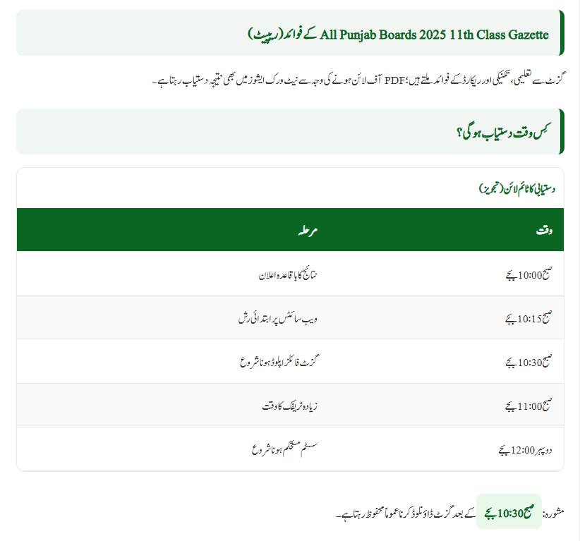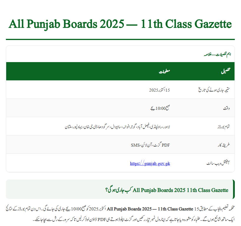 According to the Punjab Board authorities, the All Punjab Boards 2025 11th Class Gazette will be officially released on October 15, 2025, at 10:00 AM. All Punjab boards will publish their gazettes at the same time.