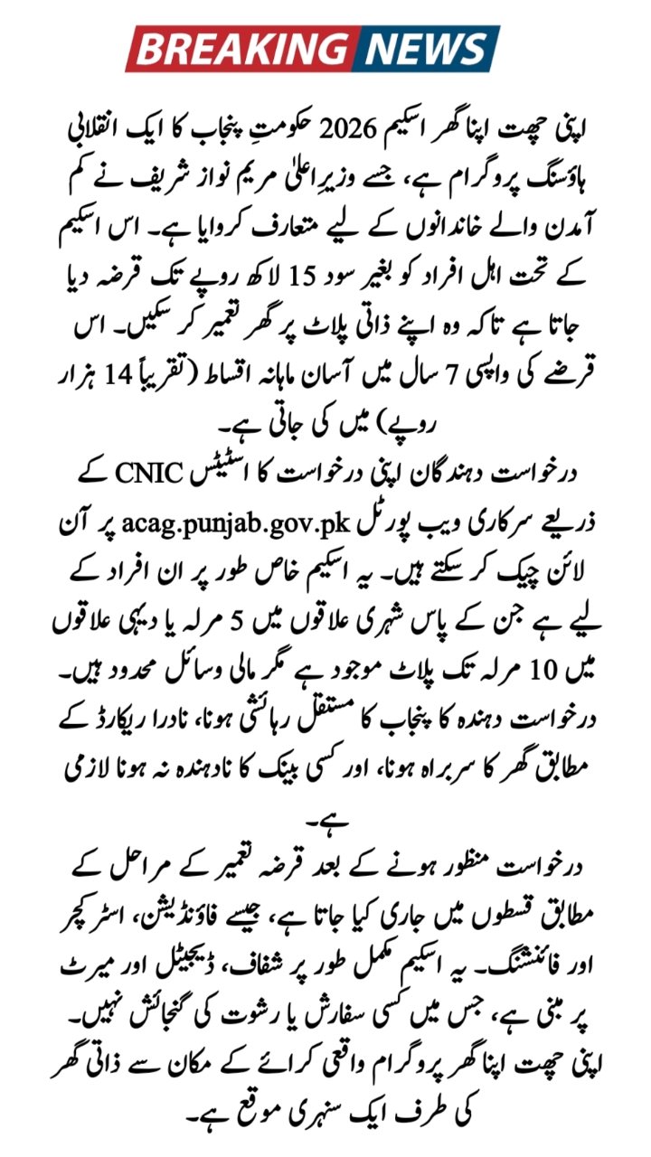 The Apni Chhat Apna Ghar scheme 2026 is a golden opportunity for Punjab residents to transition from tenants to homeowners. Using the official portal at acag.punjab.gov.pk, you can track your application status using your CNIC. Whether you have a 10-marla plot in a village or a 5-marla plot in a city, this interest-free loan can transform your life. Keep checking your dashboard weekly and ensure your phone is active for official SMS alerts.
