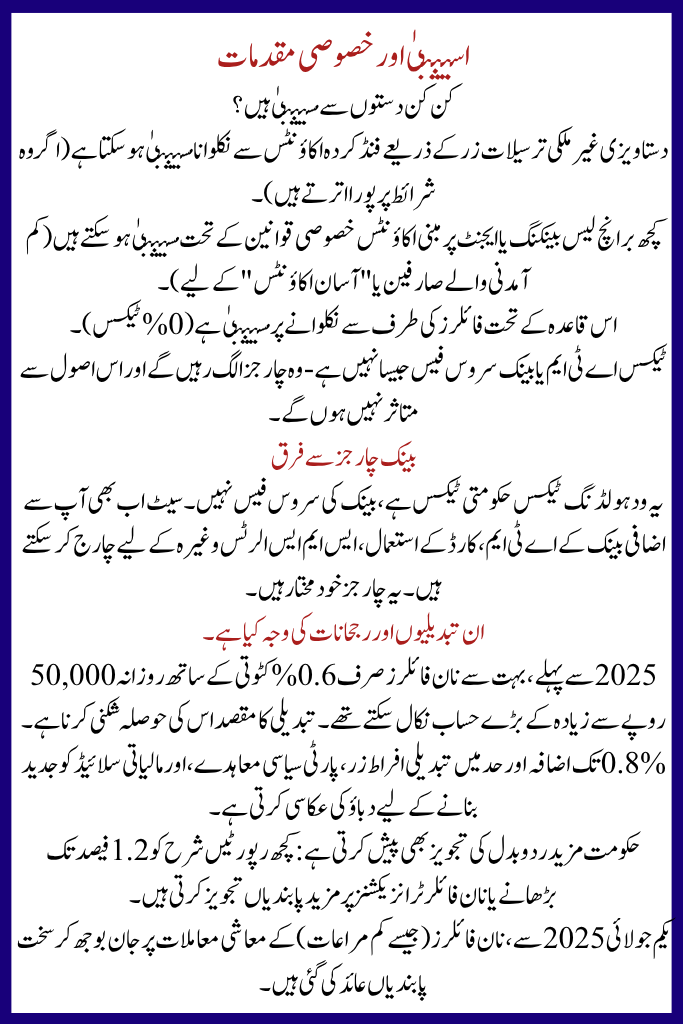 - In the 2025–26 Finance Bill, the government decided to raise the withholding tax rate for non-filers on cash withdrawals from 0.6% to 0.8%.