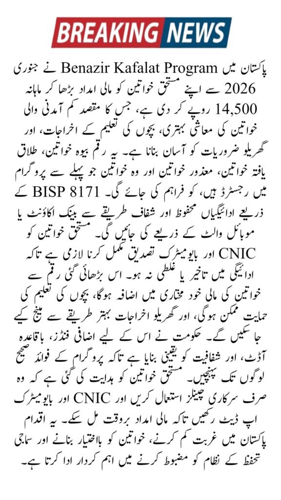 The increase of the Benazir Kafalat monthly stipend to Rs. 14,500 from January 2026 is a significant step toward supporting vulnerable women in Pakistan. With secure payment methods, biometric verification, and government oversight, the program continues to play a vital role in poverty alleviation and women’s empowerment. Beneficiaries should stay informed through official BISP channels to ensure timely receipt of funds.