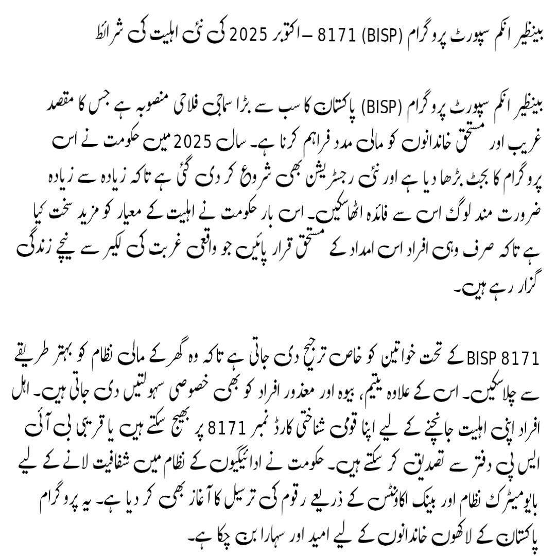 In the current economic situation, millions of families are struggling to meet their daily needs. BISP 8171 acts as a lifeline for these people, especially women who manage household responsibilities. The program gives priority to widows, orphans, and persons with disabilities, ensuring that no deserving individual is left behind.