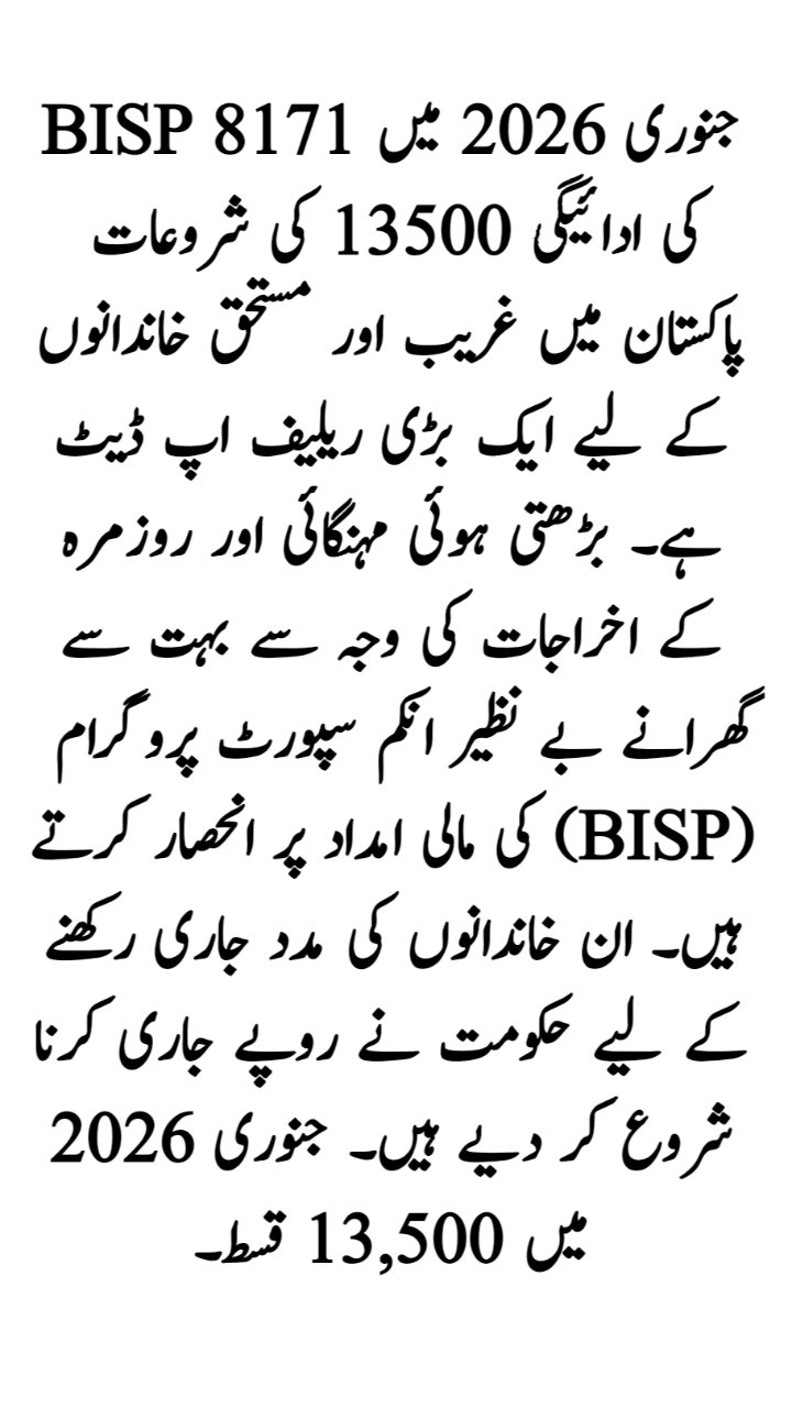 The BISP 8171 payment 13500 start in January 2026 is a major relief update for poor and deserving families in Pakistan. Due to rising inflation and daily expenses, many households depend on financial support from the Benazir Income Support Programme (BISP). To continue helping these families, the government has started releasing the Rs. 13,500 installment in January 2026.