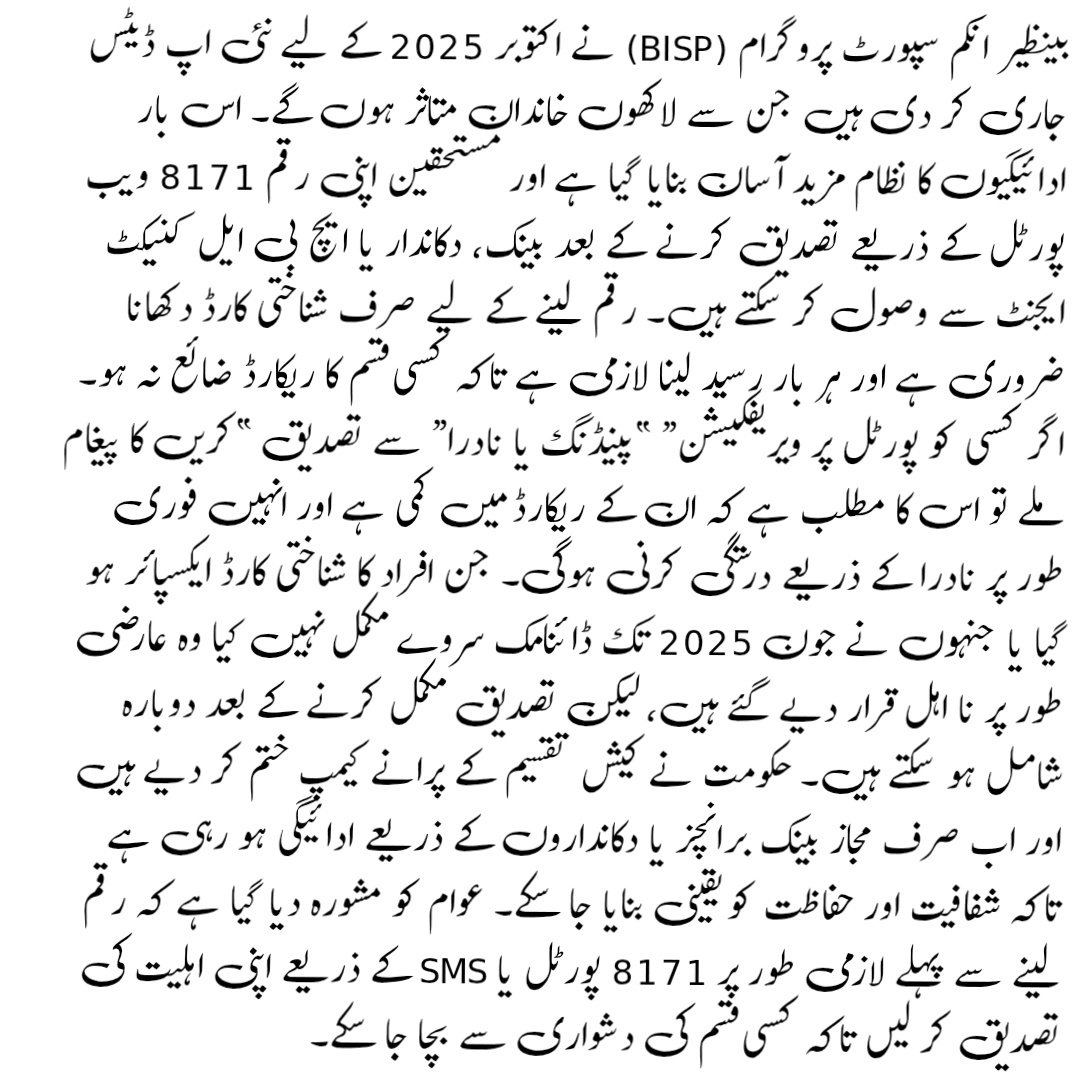 The October 2025 BISP update has simplified the payment process and made it more secure. Families can now confirm their eligibility through the 8171 web portal, SMS, or helpline, while payments are safely delivered through banks, shops, and digital wallets. Staying updated with CNIC records and following the correct procedure is key to avoiding disqualification and ensuring timely financial support.