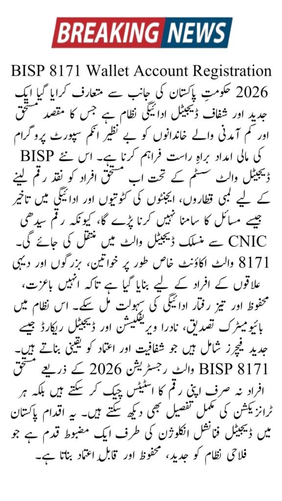 The BISP 8171 Wallet Account Registration 2026 is a major digital step by the Benazir Income Support Programme (BISP) to improve cash transfer transparency, payment security, and beneficiary convenience. This BISP 8171 wallet system allows eligible families to receive financial assistance directly into a digital wallet linked with CNIC, removing cash handling issues and agent interference. The BISP digital wallet 2026 is specially designed for low-income families and women beneficiaries, ensuring dignity, speed, and trust in government welfare payments.