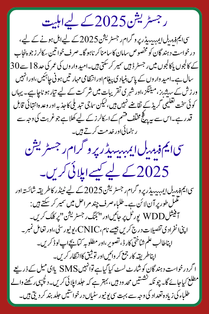 The CM Female Ambassador Program Registration 2025 is an vital inventiveness ongoing by the Punjab administration to support and authorize new women in colleges and schools. It is run by the Ladies Growth Department (WDD) and stretches womanly scholars the accidental to learn management, support, and significant lifetime skills. Girls who remain designated as envoys receive once-a-month stipends, certificates, and bodybuilding to help them grow. The package also focuses on sureness structure and civic organization. Registration is currently open for 2025, and numerous students are before smearing to join this life-changing chance.