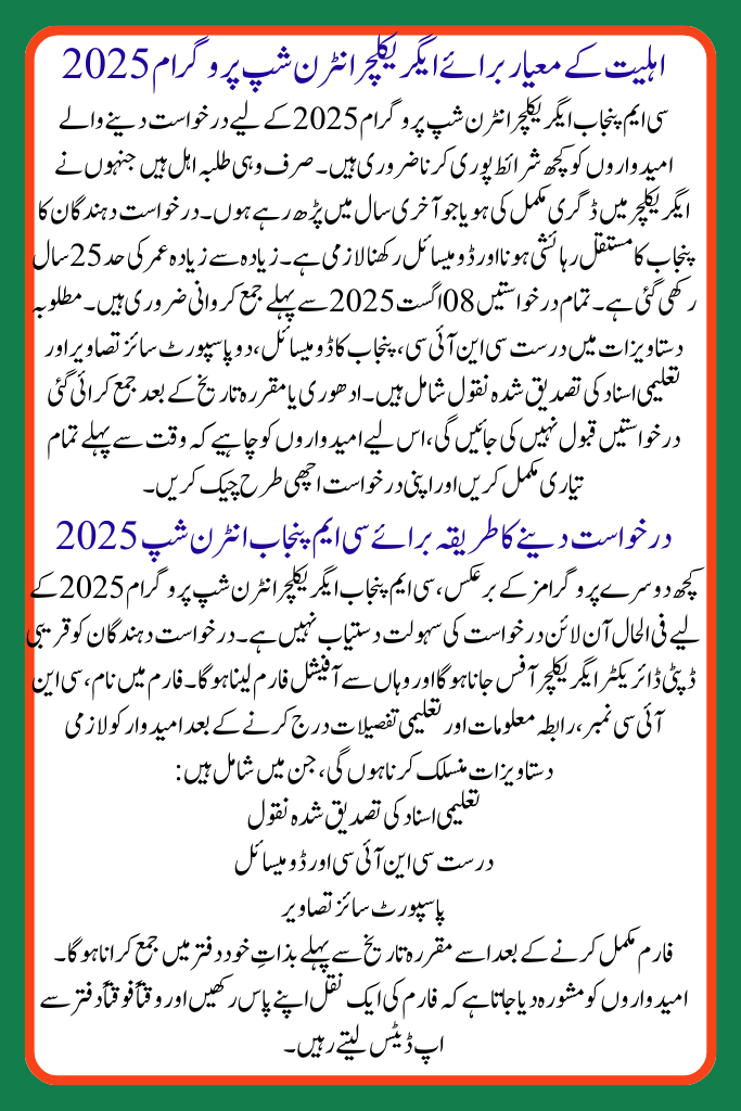 To apply for the CM Punjab Agriculture Internship Program 2025, candidates must encounter specific conditions. Only agriculture graduates or final-year students from documented colleges are eligible. Applicants must be permanent residents of Punjab and hold a valid domicile. The age limit is set at 25 years or younger. Requests must be succumbed before 08 August 2025. Required leaflets include a valid CNIC, Punjab residence, two passport-size photos, and attested educational certificates. Any incomplete or late requests motivation not be accepted, so applicants must prepare initial and prudently checkered their forms.