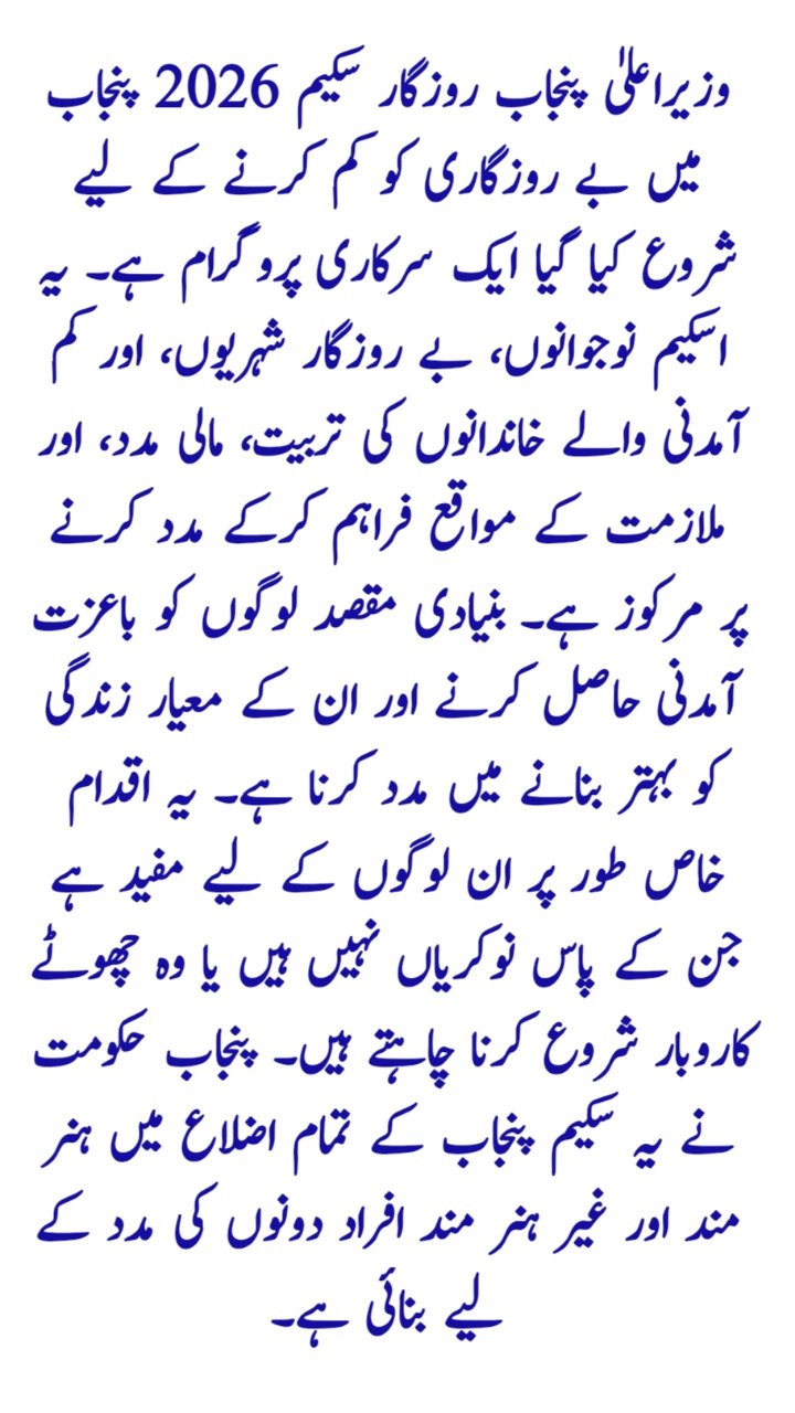 The CM Punjab Rozgar Scheme 2026 is a government program started to reduce unemployment in Punjab. This scheme focuses on helping young people, unemployed citizens, and low-income families by providing training, financial support, and job opportunities. The main goal is to help people earn a respectable income and improve their living standards.
