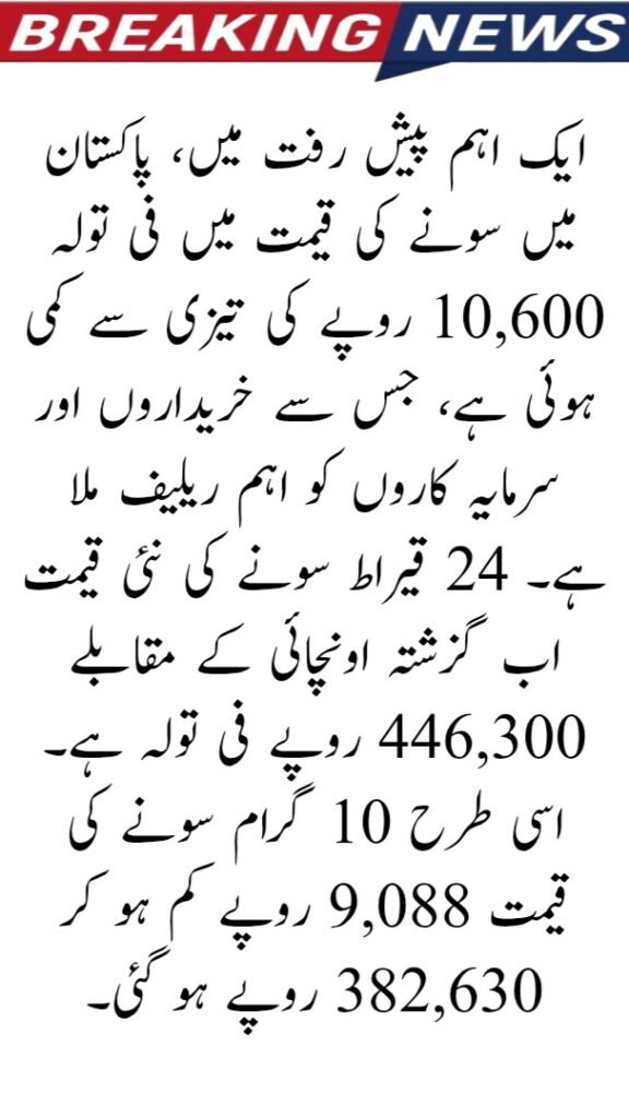 In a major development, the gold rate in Pakistan has dropped sharply by Rs 10,600 per tola, bringing significant relief to buyers and investors. The new price of 24-karat gold now stands at Rs 446,300 per tola, compared to previous highs. Similarly, the rate for 10 grams of gold has fallen by Rs 9,088, making it Rs 382,630.
