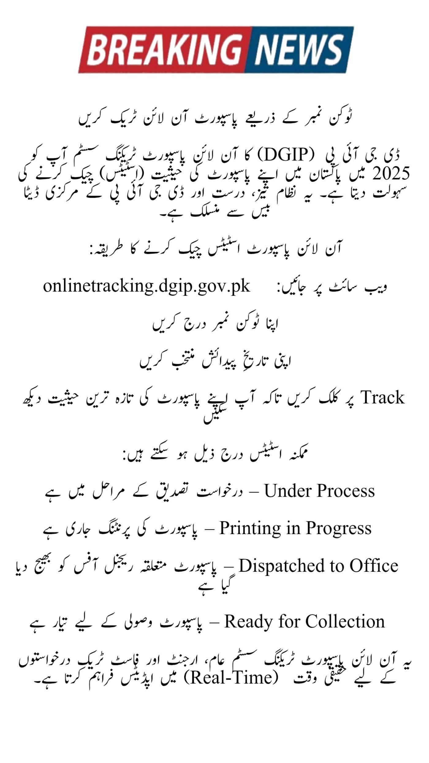 The process of passport tracking in Pakistan 2026 has become faster and easier than ever. The Directorate General of Immigration and Passports (DGIP Pakistan) has digitized its entire tracking system. Applicants can now track passport by SMS, online portal, or token number within seconds. Whether you applied for a normal, urgent, or fast-track passport, this system ensures you stay updated without visiting any passport office.Every applicant receives a tracking token number after applying, which helps monitor the passport application status from submission to delivery. The latest DGIP digital upgrade has made the process transparent for all Pakistanis.