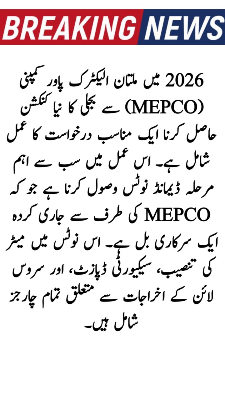 Getting a new electricity connection from Multan Electric Power Company (MEPCO) in 2026 involves a proper application process. The most important step in this process is receiving the Demand Notice, which is an official bill issued by MEPCO. This notice includes all charges related to meter installation, security deposit, and service line costs.