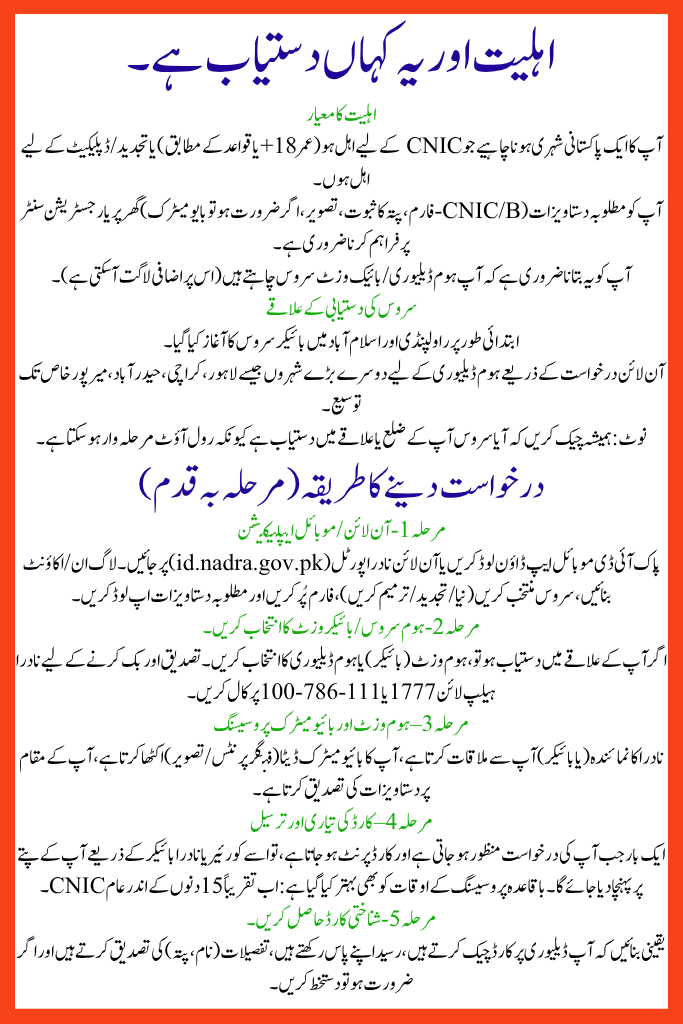 NADRA Home-Delivery ID Service service means that instead of successful to a registration centre and waiting in files, a mobile service (or biker) can visit your home or location, process your request (biometrics, photo etc) and advanced deliver the ID card to your doorstep.