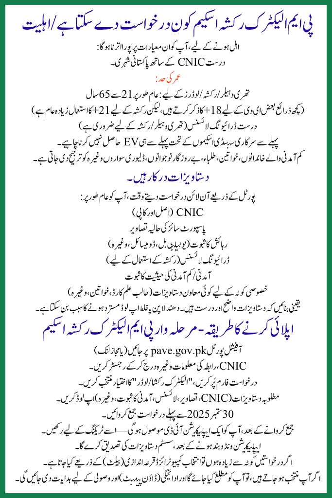 The PM Electric Rickshaw Scheme 2025 is part of the larger PAVE (Pakistan Accelerated Vehicle Electrification) initiative under the New Energy Vehicle Policy 2025–30. The government aims to support lower‑income citizens by offering electric rickshaws (and other EVs) with heavy subsidies and easy financing to generate employment, reduce fuel costs, and promote clean transport.