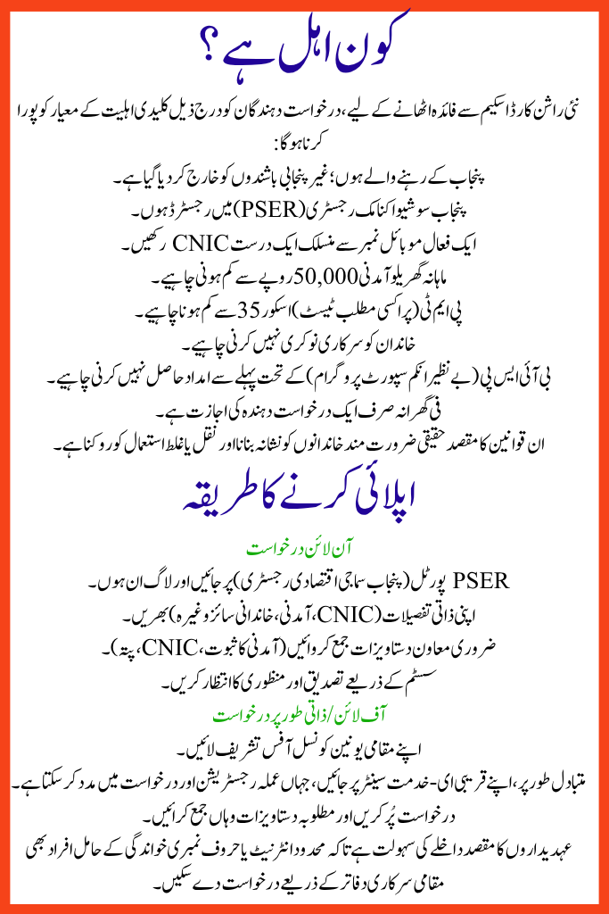 The Punjab government’s numerical ration postcard scheme (sometimes called Rashan Card Program) aims to provide monthly financial relief to vulnerable relations. Under this program, approved households receive Rs 3,000 per month, which they can use through a smart digital card at contributing grocery and utility stores to buy essential items.