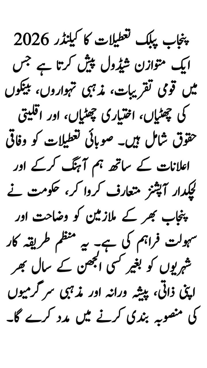 The Punjab government has also confirmed bank holidays and optional leave policies for 2026 to accommodate financial operations and religious diversity.