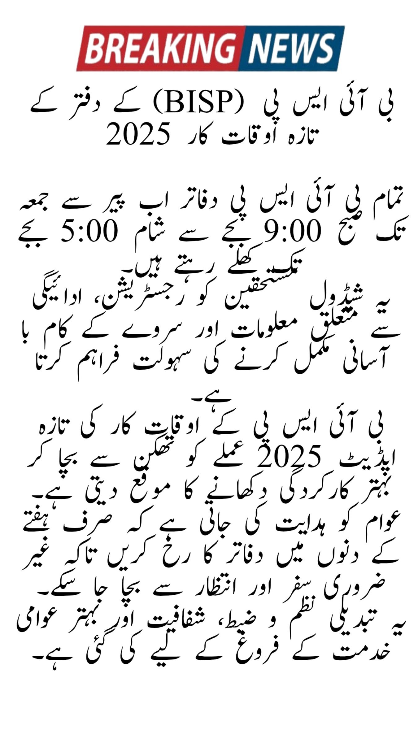 Latest BISP Office Timings 2025